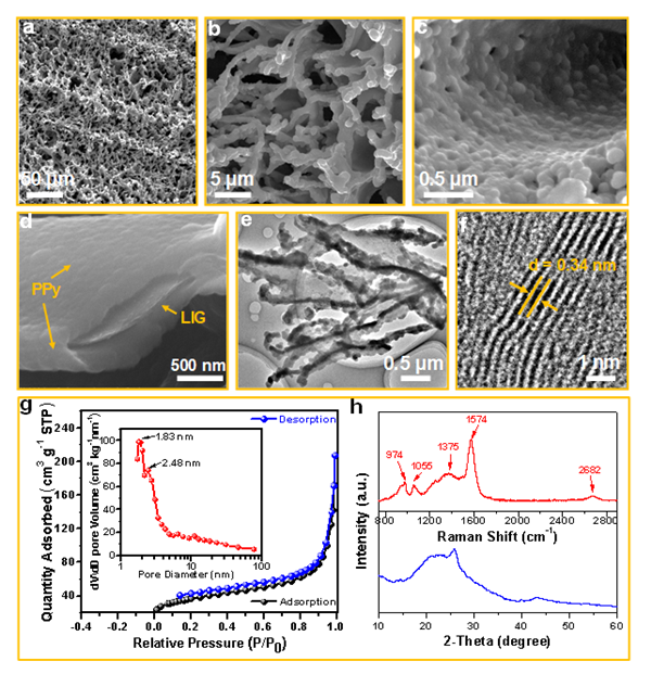 图2. 石墨烯/聚吡咯复合电极材料的结构表征。
