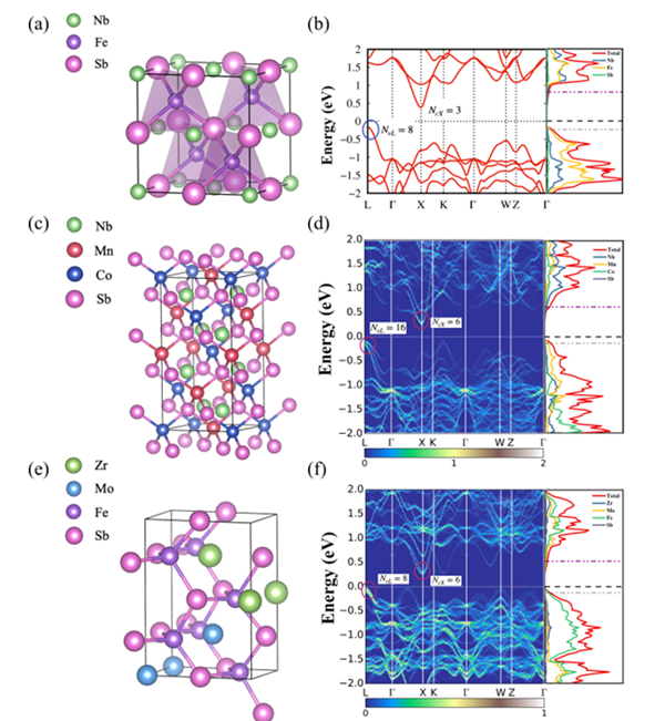 图1. NbFeSb,Nb4Mn2Co2Sb4和Zr2Mo2Fe4Sb4的晶体结构(a,c,e)及其电子结构(b,d,f)。