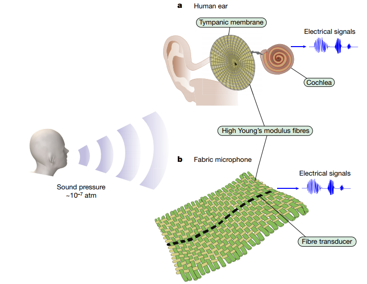 近日,麻省理工学院 Yoel Fink团队Wei Yan一作,在Nature上发文,报道了一种听觉系统仿生织物,可以作为灵敏的听觉麦克风,同时保留了织物的传统品质,如机洗性和悬垂性。织物介质是由棉经纱cotton warp纬纱weft中的高杨氏模量纺织纱线 textile yarns组成,将可听频率10-7个大气压微弱压力波,转换为低阶机械振动模式。编织到织物中的是热拉伸复合压电纤维,其与织物一致并将机械振动转换为电信号。