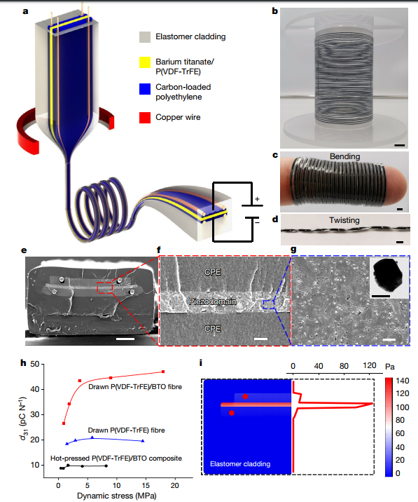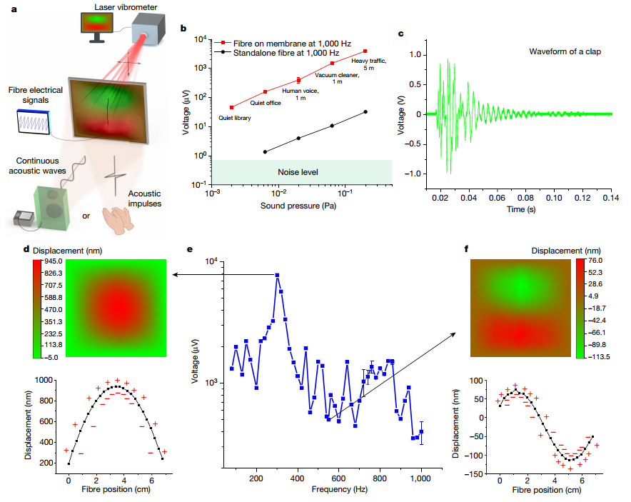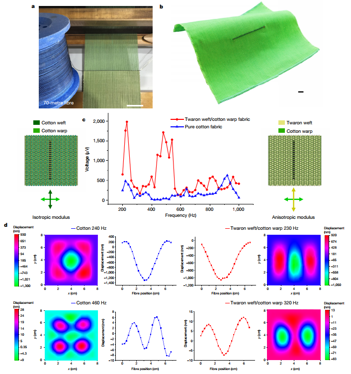 纤维灵敏度的关键是弹性覆层,该覆层将机械应力集中在压电复合层中,该压电复合层具有大约每牛顿46皮库伦的高压电电荷系数,这是热拉伸工艺的结果。响应于可听声激励的电输出和空间振动模式的同时测量,揭示了具有纳米振幅位移的织物振动模式是纤维电输出源。由于纤维占织物体积比例小于0.1%,一次纤维拉伸,就能制造出数十平方米的织物麦克风。