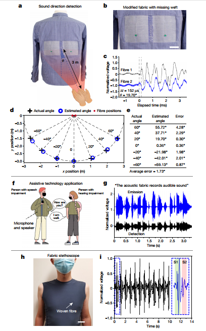 该项研究,实现了声学织物的原理、材料和机制。所得到的织物,能够以与商用麦克风相当的性能,有效地检测可听见的声音。在声音方向检测、声学通信和心音听诊方面的应用表明,该技术具有广泛适用性,可促进基于织物的人机界面、生理监测和保健、航空航天工程、通信、生物医学、机器人和计算织物发展。