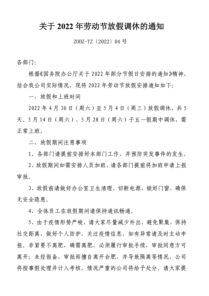 安博(中国)创新安博(中国)2022年劳动节放假调休通知