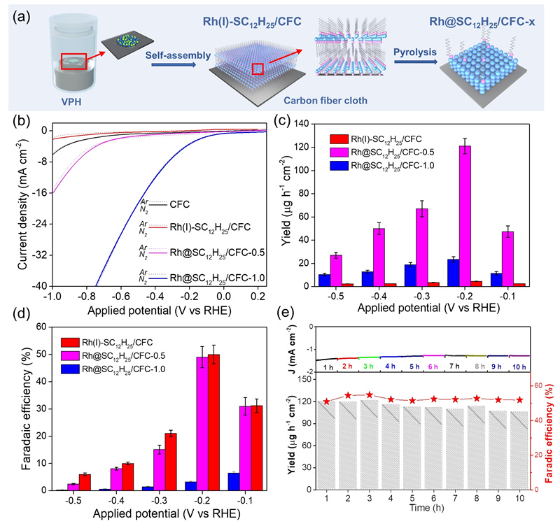 图1. (a)Rh@SC12H25/CFC-x催化剂的制备示意图。(b)Rh(I)-SC12H25/CFC、Rh@SC12H25/CFC-0.5、Rh@SC12H25/CFC-1.0、CFC电极分别在Ar和N2饱和的0.1 M Na2SO4溶液中的LSV曲线;Rh(I)-SC12H25/CFC、Rh@SC12H25/CFC-0.5、Rh@SC12H25/CFC-1.0电极在不同电位下氨生成(c)产率;(d)法拉第效率;(e)Rh@SC12H25/CFC-0.5在-0.2 V过电位下循环反应10次对应的产率、法拉第效率、阴极电流。