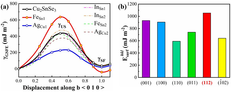 图1. (a) Cu2SnSe3的广义层错能和 (b) AgInSnSe4的表面能。