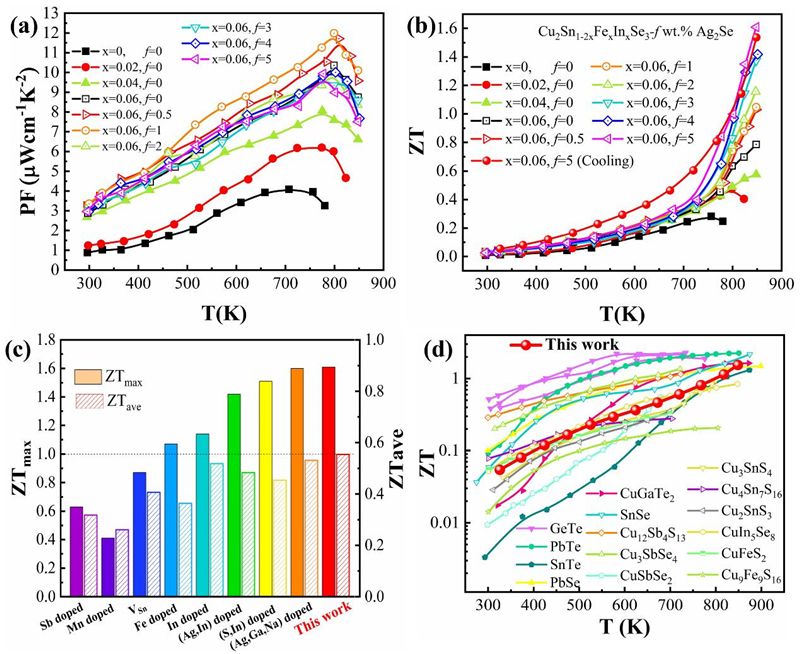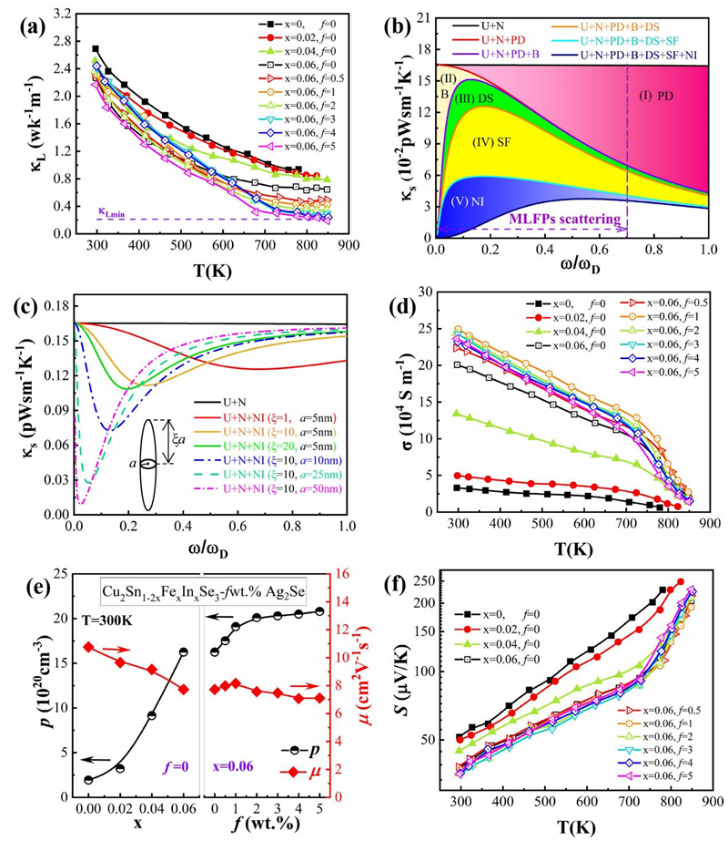 由于多元合金/化合物里MLFPs主导热输运,因此有效散射MLFPs是降低晶格热导率κL的关键。研究人员通过元素掺杂降低Cu2SnSe3的层错能 (图1)以及利用Ag2Se 与Cu2Sn0.88Fe0.06In0.06Se3的固相反应来分别引入高密度的堆垛层错和以[112]为轴的内生AgInSnSe4纳米针 (如图2和图3) 来有效散射MLFPs。第一性原理计算表明纳米针形成的内因是其 (1 1 2) 晶面具有高的表面能 (如图1)。理论分析发现,纳米针的纵横比是一个调控散射声子的额外自由度,通过改变纵横比可以散射不同频率的声子。平均径向尺寸为50nm、纵横比等于10的纳米针可以和堆垛层错一样显著散射MLFPs (如图4),结合点缺陷及其它散射机制实现对Cu2SnSe3声子的全频谱散射,使其晶格热导率在848K时降低至理论最小值~0.2WK-1m-1。与此同时,研究表明在Cu2SnSe3的Sn位掺Fe以及Cu位掺Ag可以增加价带顶的态密度,并且Sn位掺Fe还可以构建额外的空穴传输通道(如图5),这使其功率因子提升了3倍,在800K时达到了12μWcm-1K-2。最终,Cu2SnSe3的最高ZT值在848K时可达到1.61,是目前本体系报道的最高值 (如图6)。相关工作为Cu2SnSe3及其它热电材料的热电性能调控提供了新思路。
