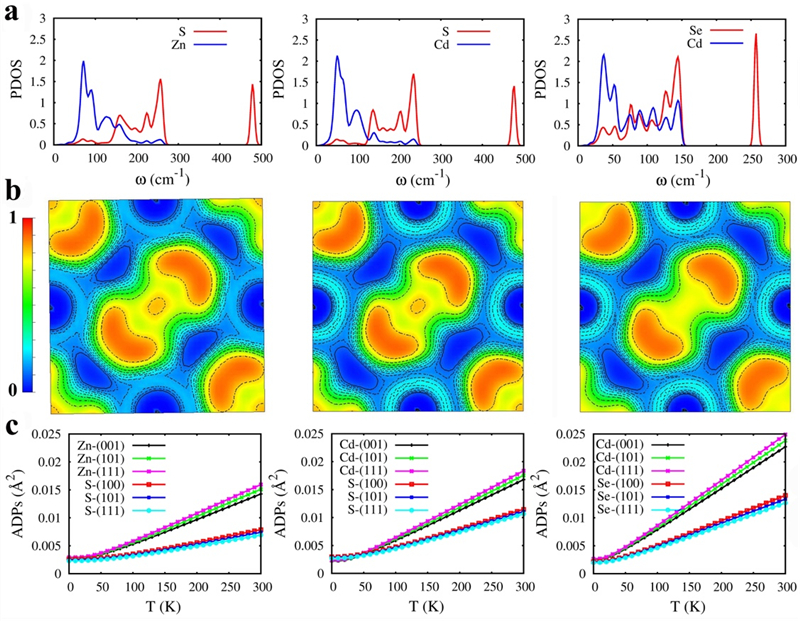 图2. 三种Pyrite型化合物中不同原子贡献的声子态密度(PDOS)(a),强的非金属二聚体上的局域电荷分布情况(b)和具有类rattling效应的金属原子的原子位移参数(ADP)在不同温度下的变化情况(c)。