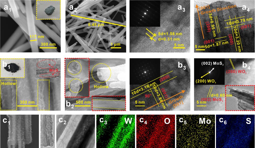 图1. WO3-x和WO3-x@MoS2扫描电镜、高分辨透射电镜和元素Mapping图。
