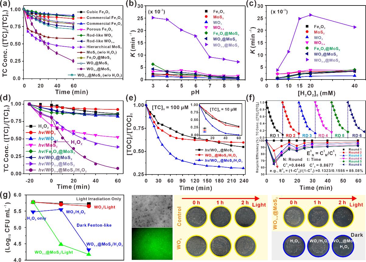 图2. WO3-x@MoS2催化剂对TC降解和大肠杆菌灭活的性能评估。