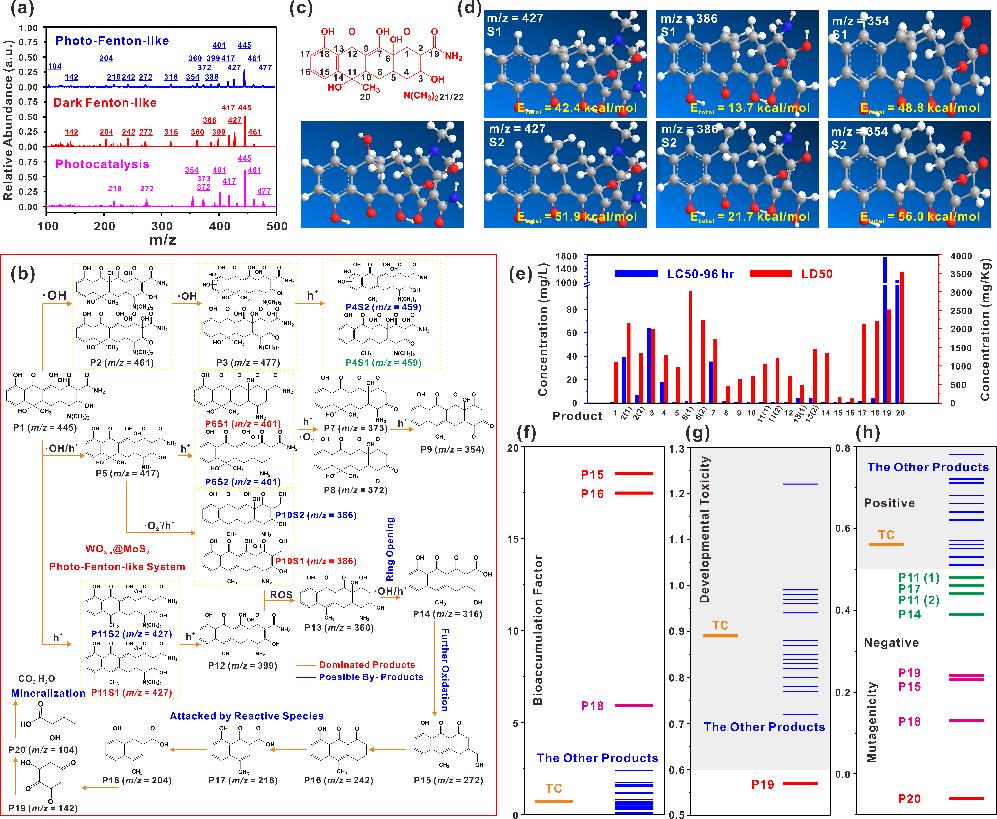 图3. TC降解的路径分析以及其产物的鉴定和毒性评估。