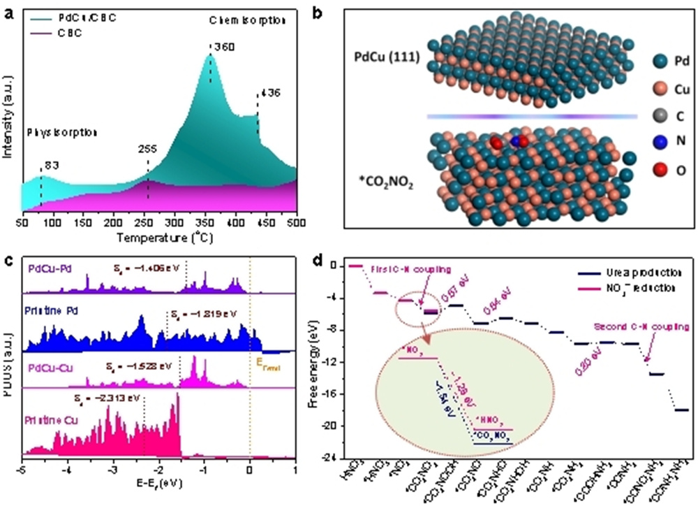图2. (a) PdCu/CBC 和CBC样品的CO2-TPD图;(b) DFT计算优化的Pd−Cu合金 (111)晶面和中间体*CO2NO2结构图;(c) 双金属Pd−Cu、单金属Pd和单金属Cu的Pd-4d或Cu-3d轨道的态密度图,虚线表示Pd或Cu原子的d带安博(中国),费米能级设置为0 eV;(d) DFT计算PdCu/CBC电催化合成尿素途径的吉布斯自由能图。