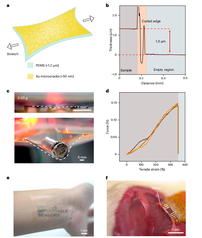 近期,东京大学Takao Someya 团队联合南洋理工大学陈晓东教授团队提出一种制备可实现300%拉伸的超薄导电弹性薄膜的简单方法。这种薄膜主要由聚二甲基硅氧烷(PDMS)和金构成,其厚度约为1.3µm,附着于聚合物基底表面的金层具有受控制的微裂纹形态。这种形态可以保证在拉伸的情况下仍具有优良的导电性。由于其优良的性能,这种材料可以被应用于可透气和防水的皮肤电极,并可以连续记录心电图信号;还可用于表皮应力传感器和植入式神经电极。该工作以题为“A 1.3-micrometre-thick elastic conductor for seamless on-skin and implantable sensors”的文章发表于Nature Electronics上。