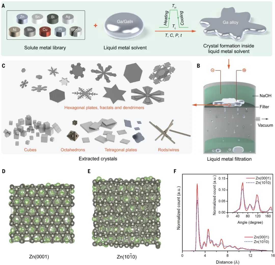 要点:1、本工作以Ga液态金属为反应介质,合成了多种具有不同晶形的金属晶体(图1)。在高温下(TH),溶质金属首先溶解在Ga中(图1A)。形成均匀的液态合金后,本工作将其冷却到室温(TL),以使溶质金属过饱和并以晶态形式从液态金属溶剂中析出,而Ga块体由于过冷而保持其液态。2、本工作首先尝试通过多孔尼龙滤膜(孔径: 20μm)过滤金属胶体溶液。然而,液态Ga的高表面张力阻碍了金属晶体析出物与液态金属溶剂的分离。为了打破表面张力,本工作在NaOH溶液(1 mol L-1)中对液态金属施加+5 V的电位,同时施加真空辅助过滤。电化学驱动已被证明可以使液态金属的表面张力从自然值调节到接近零。施加电压后,液态金属因其表面张力的急剧下降而瞬间扁平膨胀。降低表面张力后,液态Ga能够与NaOH溶液一起通过过滤器。3、本工作的测量表明,几乎整个体积的液态Ga可以穿过多孔膜,留下顶部有Ga痕迹的晶体。在使用NaOH进行额外的洗涤步骤以去除过滤残渣中剩余的Ga之后,本工作获得了干净的金属晶体(图1C)。根据金属溶质的选择、本征晶格结构和结晶动力学,本工作可以通过调节生长条件来产生复杂而独特的晶体形貌。