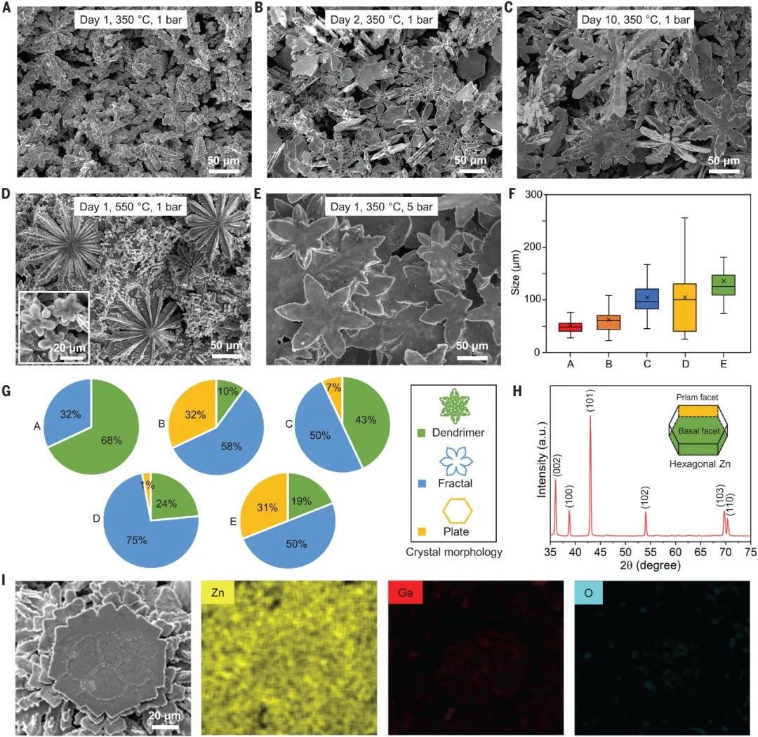 要点:1、AIMD模拟预测的Zn(0001)择优取向通过本工作在液态Ga中Zn晶体生长的实验观察得到了验证。当使用Zn作为溶质时,在液态Ga中形成的晶体非常类似雪花形貌,特别是考虑到从单个Znx-Gay系统(Zn的xwt%和Ga的ywt%)中获得的高度变化的晶体类型。2、从同一Zn10Ga90样品中提取的Zn晶体具有不同的结构,如图2(A)~(C)中的扫描电子显微镜(SEM)照片所示,改变生长条件(时间、温度和压力)会引起明显的结构变化(图2,A到G)。当Zn含量为10%时,室温下Zn在液态Ga中的溶解极限为3.64wt%。观察表明,增加生长时间,通常会导致更大的晶体生成(图2F)。尽管它们的形状不同,但所有的晶体都具有六重对称性,这源于Zn的六方晶格结构,如本工作的X射线衍射图谱(图2H)所示。3、除了AIMD模拟外,本工作基于Zn-Ga体系的热力学性质,利用factsage软件8.0模拟验证了六方Zn晶体的形成。从X射线衍射(XRD)和能量色散谱(EDS)图谱(图2中,H和I),提取的晶体是干净的,主要由Zn和可忽略的Ga组成。萃取后暴露在环境空气中的原始Zn晶体在表面自然氧化。