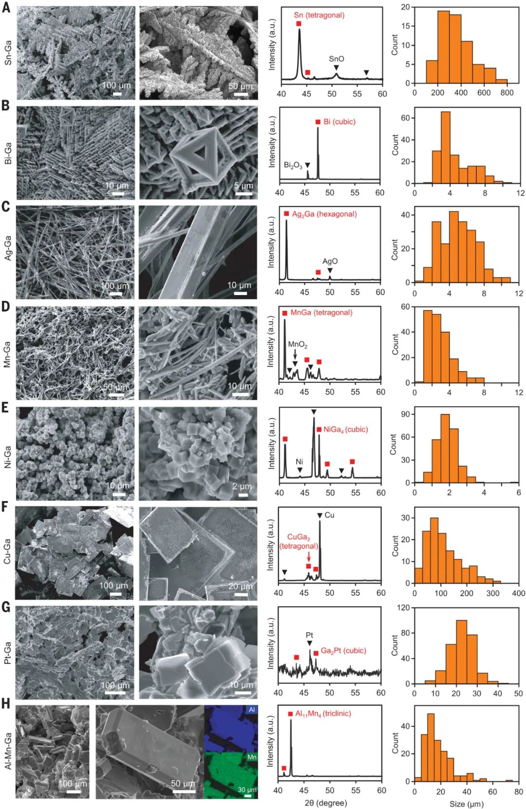 要点:1、作为一种独特的金属溶剂,液态Ga溶解了元素周期表中的大多数金属,尽管溶解程度不同。因此,该方法可以推广到其他许多溶质金属中生长和提取金属晶体。本工作用二元体系Sn30Ga70、Bi2Ga98、Ag2Ga98、Mn2Ga98、Ni2Ga98、Cu2Ga98和Pt2Ga98(图4,A到G)以及三元体系Al5Mn5Ga90证明了这一点(图4H)。本工作主要根据各自的相图和溶解度来选择浓度。2、六方相Ag2Ga和四方相MnGa金属间化合物晶体均生长出直径通常小于10 μm (图4,C和D)的高深宽比棒结构,表明二者生长具有高度的多面性和各向异性。Ni-Ga、Cu-Ga和Pt-Ga体系形成了立方相NiGa4的立方体(图4E)、四方相CuGa2的片状(图4F)和立方相Ga2Pt晶体的边角截角四方片状,以及较大的棒状和枝状结构(图4G)。3、除了金属间化合物相外,这三个体系还显示出溶质金属的单金属晶体的证据。本工作观察到的晶相可以追溯到它们在相关浓度和温度范围内的相图。在这里,通过本工作简单而高效的液态金属溶剂生长法生长化合物晶体的可能性极大地扩展了晶体库。