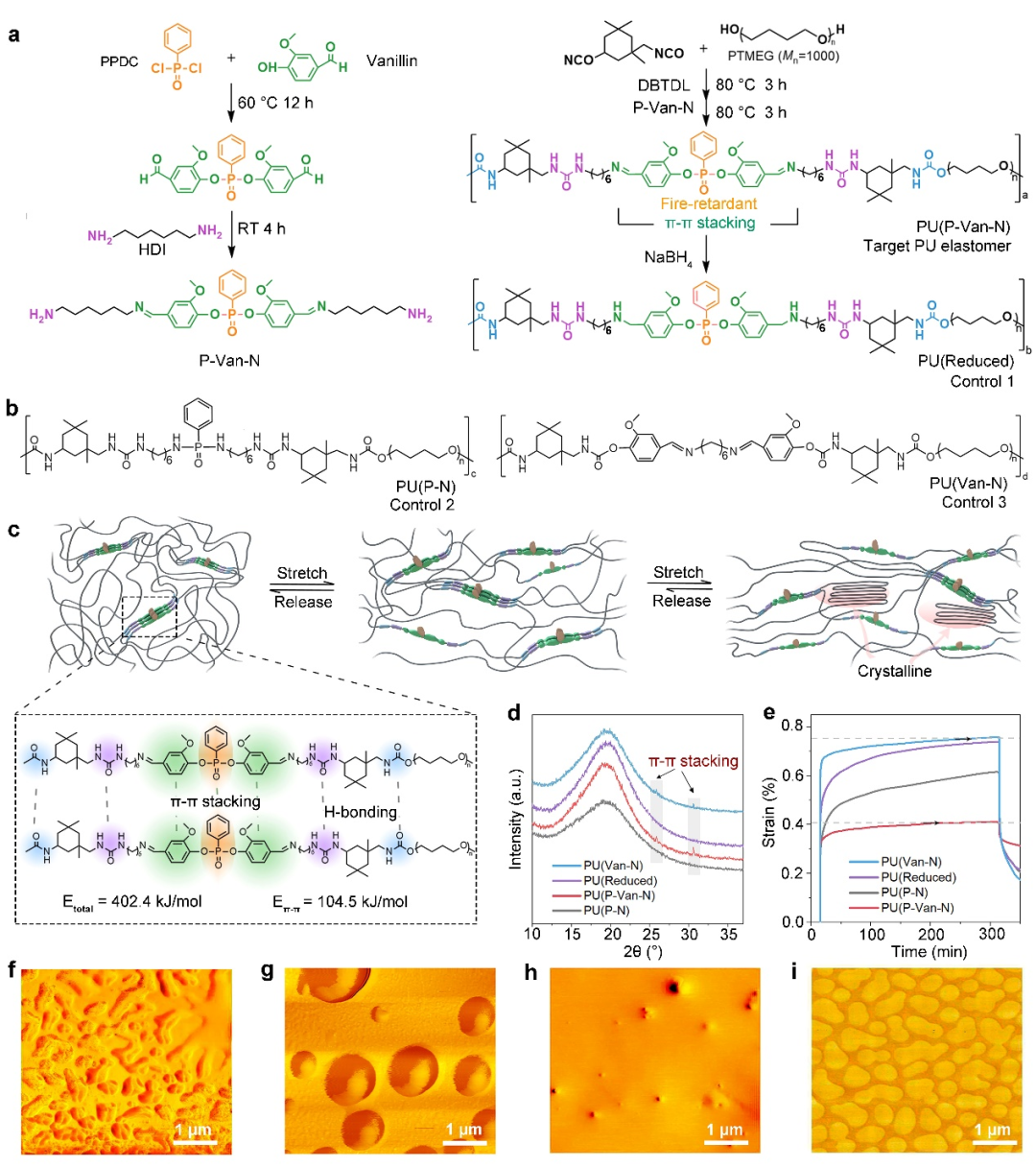 近日,中国林科院林化所周永红研究员团队联合南昆士兰大学的宋平安教授团队利用苯基磷酰二氯、生物基香草醛和1,6-己二胺设计了具有含磷基团和π-π堆叠基团的扩链剂,然后构建了强、韧且阻燃的聚氨酯弹性体PU(P-Van-N)(图1a)。为了研究席夫碱、π-π堆叠和含磷基团对聚氨酯弹性体力学性能和阻燃性能的作用,作者还设计制备三个对比样PU(Reduced)、PU(P-N)和PU(Van-N) (图1a和1b)。通过对比,PU(P-Van-N)力学和阻燃性能最佳,其出色的力学性能源于动态微相分离的微观结构导致的熵弹性增加,并在较大应变下发生应变硬化所致,而出色的自熄能力是由于含磷基团和π-π堆叠相互作用的存在。