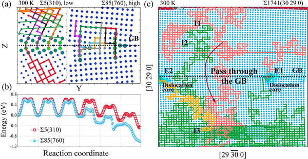 图2. 基于格点动力学蒙特卡洛(LKMC)获得的晶界附近空位运动轨迹与迁移能图景。温度设为300 K。在(c)中,I1、I2和I3代表空位初始位点,E1和E2标记最终位点。