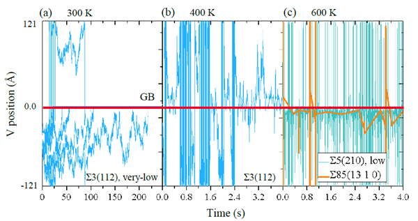 图3. 基于实体动力学蒙特卡洛(OKMC)模拟获得的晶界附近空位的运动轨迹:(a-b) Σ3(1 1 2)/[1 1 0],(c) Σ5(2 1 0)/[0 0 1]和Σ85(13 1 0)/[0 0 1]。温度分别设为300 K、400 K和600 K。水平实线标记晶界面位置。
