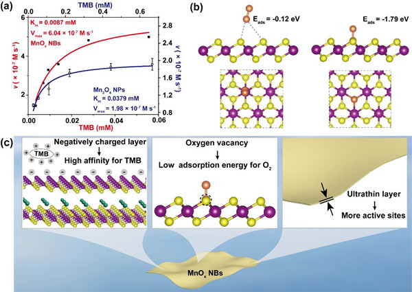 图2. (a)MnOx纳米带/Mn3O4纳米颗粒的Michaelis-Menten动力学分析;(b)有/无氧空位的MnOx纳米带的O2吸附能;(c)MnOx纳米带的类氧化酶活性机制。
