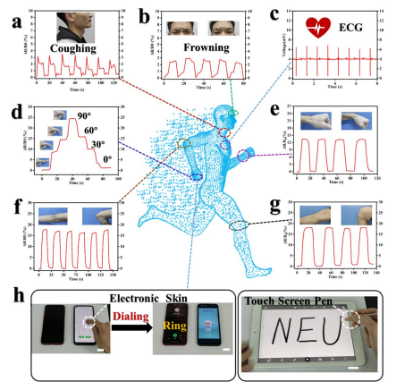 近期,东北大学医学与生物信息工程学院田野副教授团队开发了一种皮肤启发的超强韧和可回收的超分子水凝胶电子皮肤PVA-Gp/TA-CaCl2 (命名为:PGC),使用一次性物理交联盐析-冻融方法,没有有毒副产物和复杂的工艺。此工作将盐析法引入超分子自组装体系中,调节大分子链在分子上的聚集缠结,从而获得力学性能可调的水凝胶网络。盐析剂--β-甘油磷酸钠(Gp),比常用的盐析剂(如NaCl)更有效。并通过添加单宁酸(TA)来赋予水凝胶抑菌和防紫外线等性能。最后,采用一次冻融的方法进一步提高链间结晶度,从而提高其机械强度。此外,添加Gp后的水凝胶的机械强度是相同质量甘油水凝胶的37倍,拉伸应力可达3.35 MPa,Gp和PVA浓度对PGC水凝胶的机械强度均有调节作用,最终能达到5.79 MPa的抗拉强度。PGC水凝胶具有超强韧性、导电性、抗菌性、防紫外性、抗溶胀性、可回收性和透光性。PGC水凝胶电子皮肤可以将皮肤的保护特性和灵活的传感结合起来,适用于生活中的多种复杂场景。PGC水凝胶电子皮肤作为新一代电子皮肤接口,可用于精确监测日常生理活动(心电图、微表情、关节活动、咳嗽),实现人机交互。PGC水凝胶电子皮肤还用于水下人机交互,通过水下活动和莫尔斯电码传输信息,并使用解密程序对水下/陆上信息进行加密/解密。此外,利用windows系统分析软件,设计PGC水凝胶电子皮肤作为关节损伤患者肌力训练的关节康复系统,动态模拟肌力变化,反馈健康状态,实现人机交互(前端数据采集—后端分析处理)。这种多功能仿生电子皮肤将对柔性传感、康复医学、人机交互、机器人、VR/AR和元宇宙的未来产生重大影响。