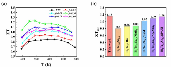 图1. (a) BTS/ fwt %MnSb2Se4 (f=0、0.25、0.40、0.50、0.75和1.00)样品的ZT随温度的变化曲线;(b)不同碲化铋(BTS)体系ZTave平均值的比较。