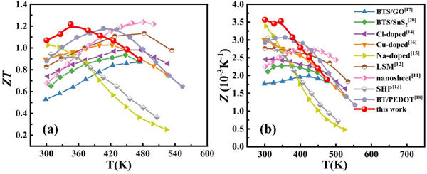 图2. (a) 不同碲化铋(BTS)体系ZT值的比较; (b) 不同碲化铋(BTS)体系Z值的比较。