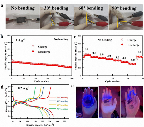 图2. (a)不同弯曲角度下的VS2@CF//Zn@CF光学照片。VS2@CF//Zn@CF电池的(b)循环性能和(c)倍率性能;(d)不同弯曲角度下的GCD曲线;(e)由VS2@CF//Zn@CF准固态电池点亮的商用LED灯条。