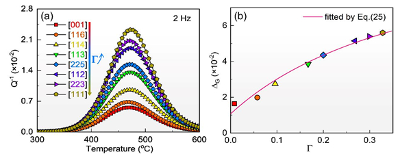 图1. (a) 不同取向Fe-17at.%Ga单晶的净Zener弛豫内耗峰;(b)净弛豫强度随取向因子的变化关系。