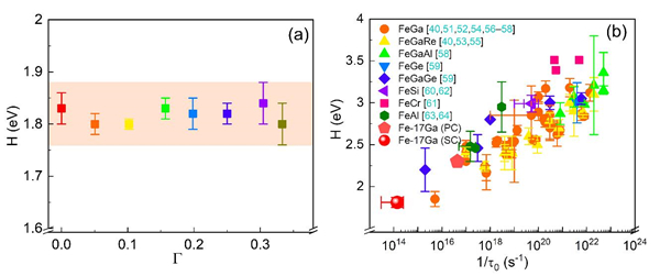 图2. (a) Fe-17at.%Ga单晶的Zener弛豫激活能随取向因子变化关系;(b)FeGa单晶与不同BCC结构Fe基合金Zener弛豫参数对比图。