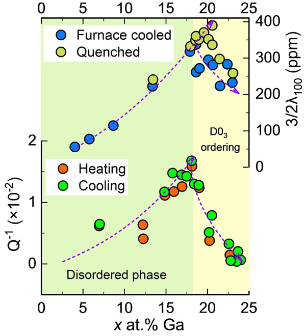 图3. FeGa合金中磁致伸缩系数和Zener弛豫强度的比较图。在有序和无序相区,磁致伸缩系数和Zener弛豫强度随Ga含量变化具有高度一致性。