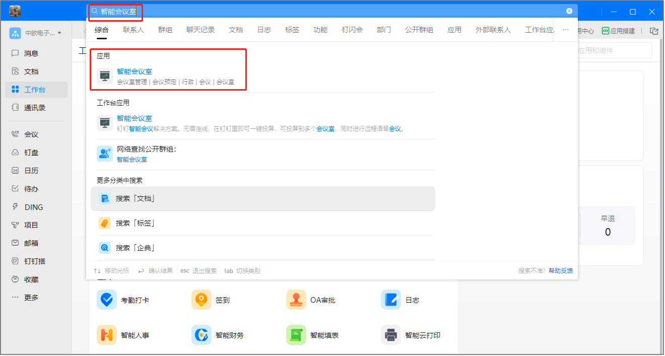 步骤一:打卡钉钉办公系统,搜索“智能会议室”,打开“智能会议室”应用。