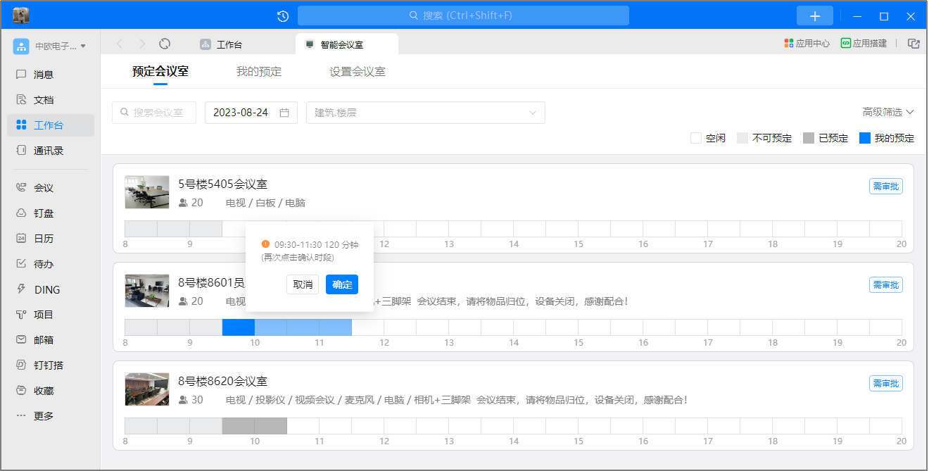 步骤二:选择会议室—选择时间段—点击“确定”。