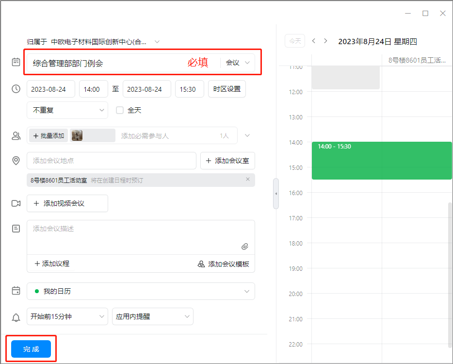 步骤三:填写会议主题(必填)—点击右上角“完成”。