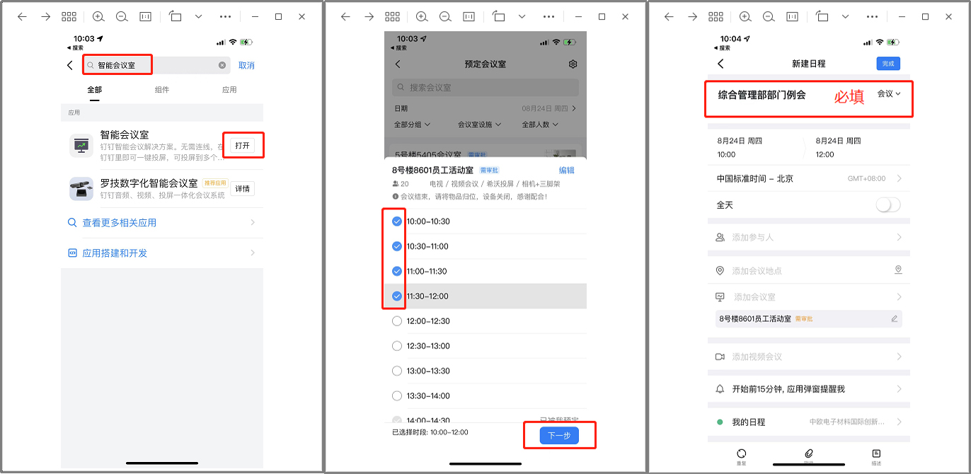 为便于各位老师及时高效的进行线上会议室预约,创新安博(中国)在钉钉办公系统中新增了“智能会议室”模块,现将使用步骤予以说明,请查阅。