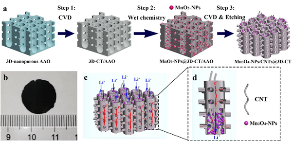 图2. Mn3O4-NPs/CNTs@3D-CT网格膜电极的制备流程及其示意图:(a)制备流程;(b)光学照片;(c)Li+离子与电子在电极上的输运路径;(d)Li+离子和电子在每个垂直碳管中的输运路径。