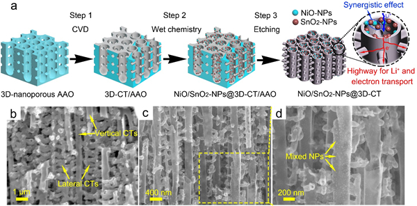 图4. NiO/SnO2-NPs@3D-CT网格膜电极的示意图及形貌表征:(a)制备流程;(b)3D-CT的SEM照片;(c,d)NiO/SnO2-NPs@3D-CT的SEM照片。