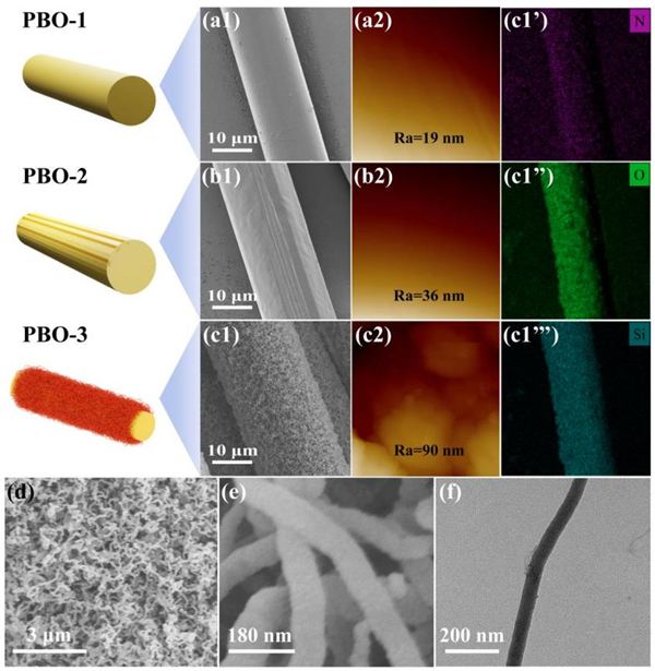 图2. 不同阶段PBO纤维的扫描电镜图(a1 - c1)和原子力电镜图 (a2 -c2)。