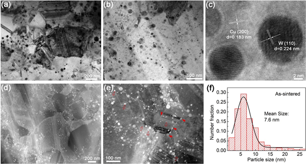 图1. 纳米结构Cu-W合金的TEM照片及W颗粒的尺寸分布。