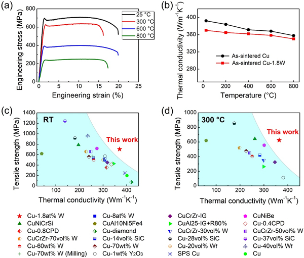 图2. 纳米结构Cu-W合金的力学性能、导热性能以及与其它铜基材料的性能比较。