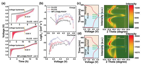 图3.(a)0.1 C时的GITT曲线;(b)根据GITT曲线计算的锂离子扩散系数;(c)R-LCO和(d)MP-LCO@LPO/CP在0.2 C电压范围为OCV~4.6 V~3.0 V首次充放电的原位XRD图谱以及相应的充放电曲线。