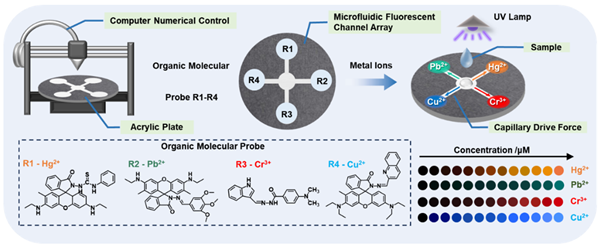鉴于此,固体所研究人员对亚克力板进行数控加工,利用毛细管驱动力和疏水内壁,设计了微流控传感器阵列。有机荧光探针具有成本低、灵敏度高、选择性好、发光性能易于调节、易于阐明反应机理等优点,可以直接与重金属离子反应生成配合物。研究人员基于微流控传感器阵列和荧光探针,研制了由4个荧光探针组成的荧光微流控传感器阵列。荧光微流控传感器阵列采用对Hg2+、Pb2+、Cr3+和Cu2+有特异响应的荧光纳米材料作为荧光纳米探针的信号响应组分,通过将一系列荧光探针与微流控传感器阵列相结合,实现了对Hg2+、Pb2+、Cr3+和Cu2+的同步实时视觉检测。基于此,进一步将微流控荧光传感器阵列与智能手机的颜色识别器相结合,实现了对环境水体中多组分重金属离子的可视化定量检测。