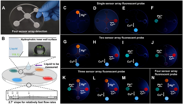 图2. (A) 荧光微流控传感器阵列;(B) 荧光微流控传感器阵列的结构和疏水内壁;(C)-(F) 纳米有机分子荧光探针单传感器阵列;(G)-(J) 纳米有机分子荧光探针双传感器阵列;(K)-(M) 纳米有机分子荧光探针三传感器阵列;(N) 纳米有机分子荧光探针四传感器阵列。