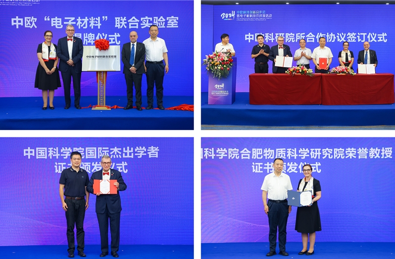 活动现场,中欧“电子材料”联合实验室正式揭牌。联合实验室将围绕电子材料关键科学问题和技术难题,开展基础创新研究和关键技术攻关。中欧科研院所成功签署谅解备忘录。宁博伦为Rodrigo Martins教授颁发中国科学院国际杰出学者(PIFI)荣誉证书。刘建国为Elvira Fortunato教授颁发合肥物质院荣誉教授证书。Rodrigo Martins教授、 Elvira Fortunato教授分别作特邀学术报告。