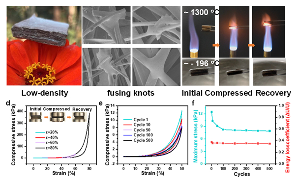 一维SiO2气凝胶虽然可以有效解决结构脆性和弹性模量问题,但其强度和耐温特性仍然有很大提升空间。鉴于此,固体所王振洋、张淑东研究员联合重庆交通大学张继祥教授,通过引入低含量ZrO2结晶相,提高一维SiO2纤维耐温特性;在耐温、低热导的一维SiO2纤维单元间通过构建多种类熔合节点,进一步增加纤维间的链接,显著提升了一维SiO2基气凝胶的压缩强度和断裂韧性。获得的一维SiO2气凝胶导热系数低至0.092 Wm-1K-1(与空气一个数量级),最大可承受弹性应变超过80%,抗压强度高达3.89×105 Pa(80% 抗压应变),同时在 -196~1300 ℃的超宽温度范围内表现出稳定的弹性和结构完整性。相关研究成果发表在Journal of Materials Chemistry A (J. Mater. Chem. A, 2024, 12, 16079-16086)上,并申请了国家发明专利(已授权)。