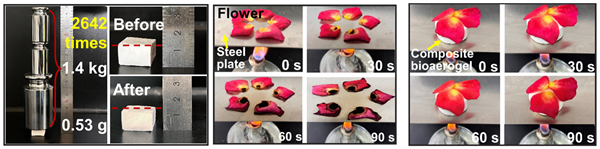 图3. 生物质气凝胶及强度与隔热性能比较。