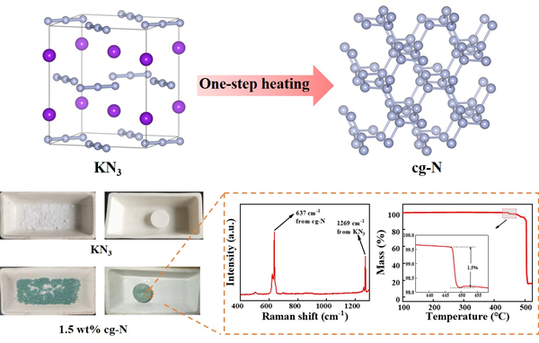 近日,中国科学院合肥物质科学研究院固体物理研究所王贤龙研究员开发出不依赖等离子体增强方法的一步加热合成技术,在克量级原材料上实现了产率最高的cg-N合成,是当前最便捷且最高效的合成技术。相关成果发表在Chinese Physics B (Rapid communication)上,并申请了发明专利。 氮氮单键和氮氮三键之间的巨大能量差异,使得完全由氮氮单键构成、具有类金刚石结构的cg-N含有很高的能量,且其释能之后的产物是无毒无害的氮气,因而成为新型高能量密度材料的典型代表之一。早期cg-N样品的合成主要是依赖高温高压技术或者等离子体增强CVD和纳米限域相结合的方法,存在样品稳定性差、合成产量低等问题,同时还缺乏对cg-N结构、热分解、爆轰性能等关键物性的表征和系统研究,制约了其实际应用。