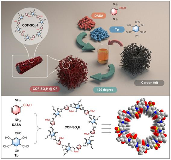 基于此,研究人员提出了一种利用焦耳热界面催化(JIC)系统的酯化反应途径,核心在于将焦耳加热与界面催化进行耦合(图1)。该系统以磺酸基共价有机框架(COF-SO3H)作为界面催化剂,碳毡作为电热源(图2)。在反应物摩尔比为1:1、加热功率密度为0.49 W cm−3时,乙酸的转化率可达80.5%,是理论平衡极限的1.29倍(62.5%)。研究表明,电热源与COF-SO3H催化剂的紧密接触实现了高效、局部的焦耳加热,减少了热损失,并精确控制了反应界面。JIC系统不仅提高了酯化效率,而且为实现高收率化学过程提供可持续的节能途径。