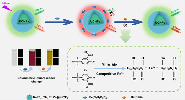 近期,中国科学院合肥物质科学研究院固体物理研究所能源材料与器件研究部蒋长龙研究员团队在可视化荧光检测方面取得新进展。该团队设计了一种基于上转换纳米颗粒的双模态传感平台,结合荧光和比色法,能够在复杂生物样本中实现高灵敏度、低检测限的胆红素检测。通过与智能手机的颜色识别功能相结合,该平台提供了便捷、快速的临床检测方案。相关研究成果已发表于Analytical Chemistry,为早期黄疸诊断提供了新的技术途径。 黄疸是一个重要的健康问题,尤其是在新生儿中。它是新生儿早期死亡的主要原因之一,会影响 60% 的新生儿。游离胆红素水平过高通常表明黄疸的存在。胆红素是血清素分解代谢过程中形成的降解产物。在健康个体中,血液中的游离胆红素水平一般在 1.7 μM 至 10.2 μM 之间。在黄疸情况下,胆红素水平异常升高,但如果浓度低于 32 μM ,则不会在患者中表现出典型的黄疸症状。因此,快速、准确地检测新生儿和黄疸患者血清中的胆红素十分必要。