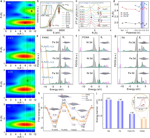 该研究中,研究人员结合了先进的原位同步辐射光谱技术和高精度的理论计算,实现了对双金属单原子催化剂在催化反应过程中瞬态结构的实时捕捉和解析。首先,通过高通量筛选确定了高效的双金属原子级电极界面,实现了Cu(II)和As(III)的并行电化学还原。原位X射线吸收精细结构(XAFS)光谱和配位场理论验证了双金属单原子体系中,由允许的d−d跃迁促进的Ni−Cu特定能级匹配,再现了电化学微观动态还原过程。进一步通过理论计算发现,Fe−As特定键合和最小势能(1.40 eV)决定步骤,这是源自关键中间体的主要s和p峰向高能轨道的线性偏移。此外,研究人员分别从动力学、热力学模型的收敛趋势和退火模拟的角度再现了自适应匹配的动态演化。